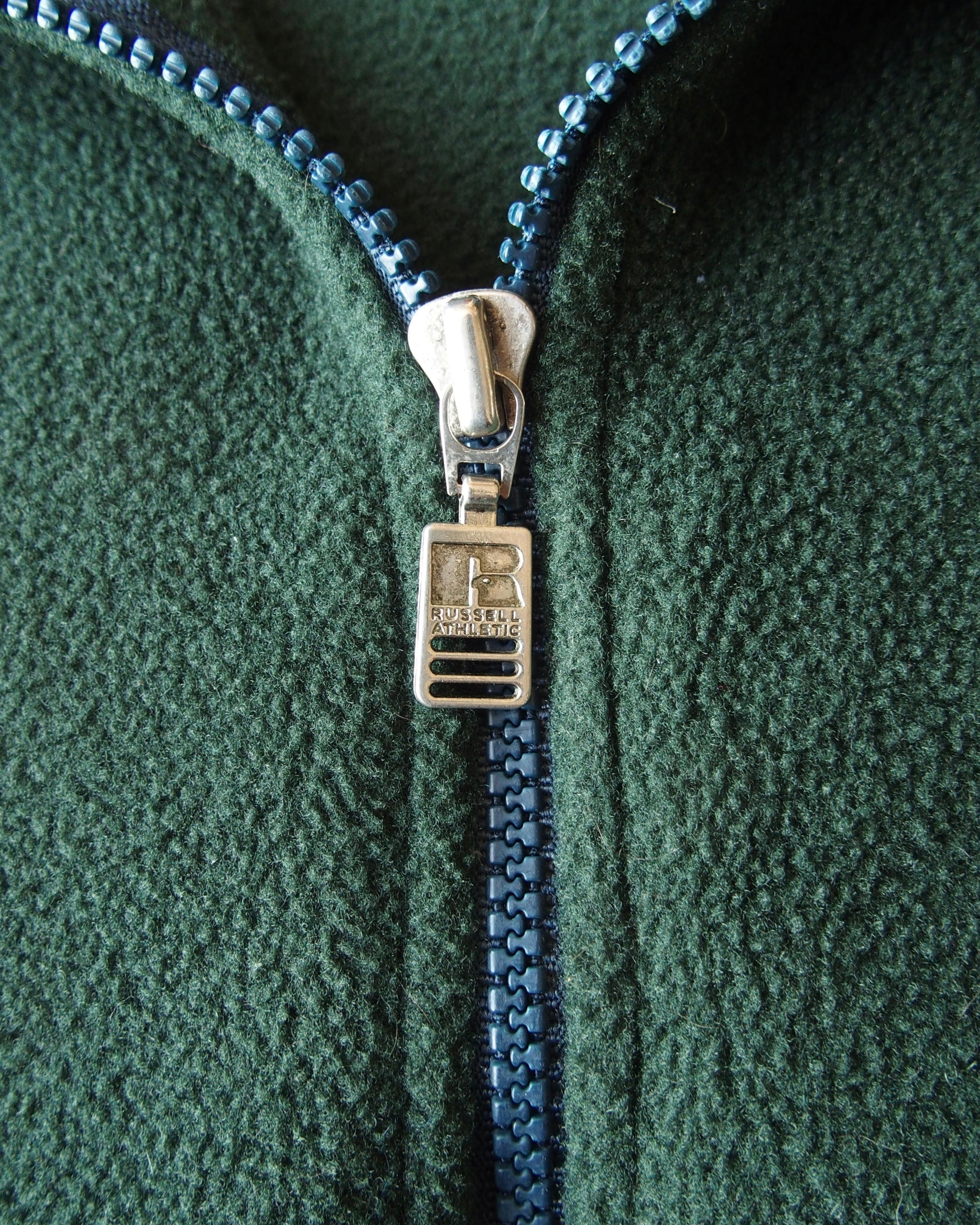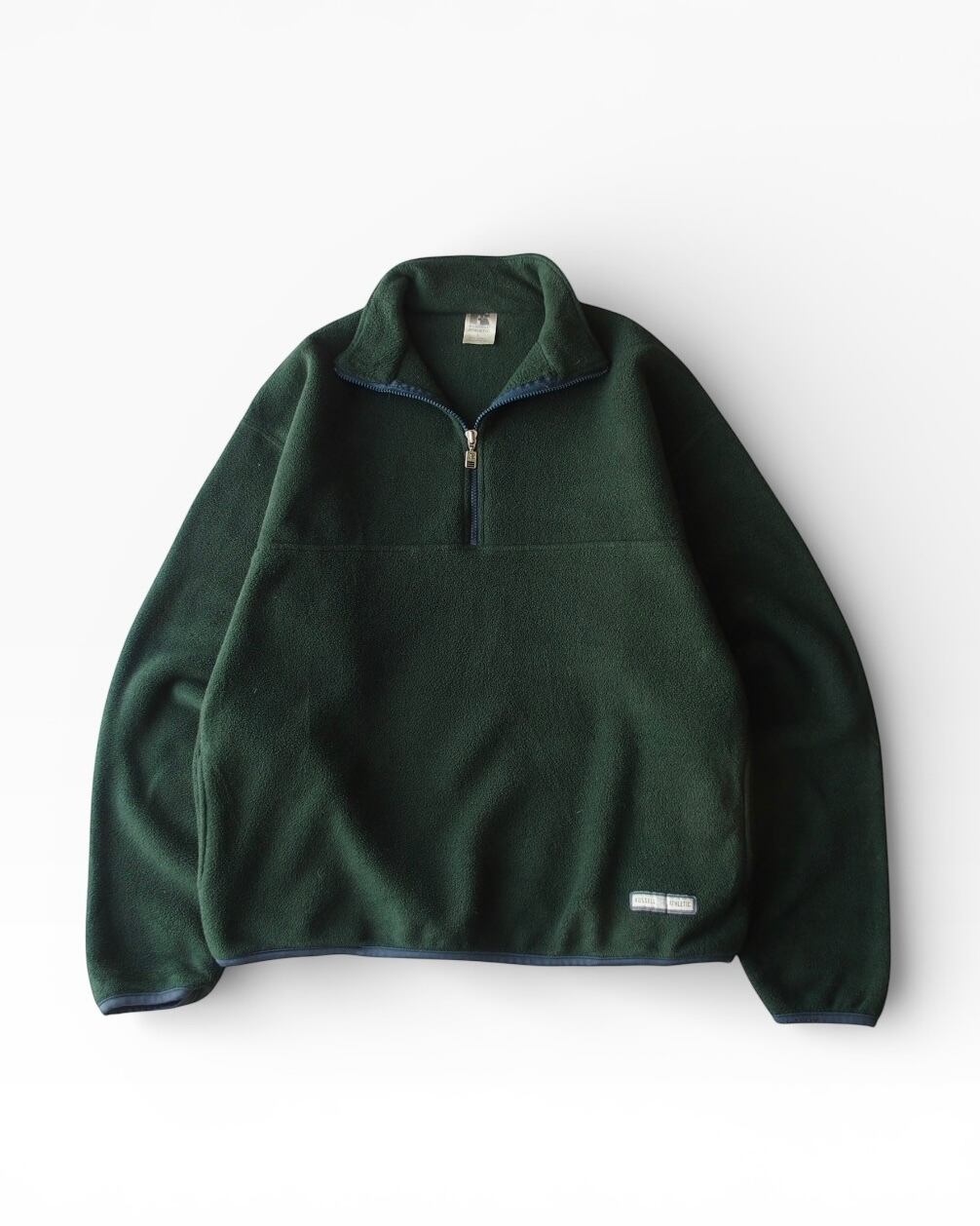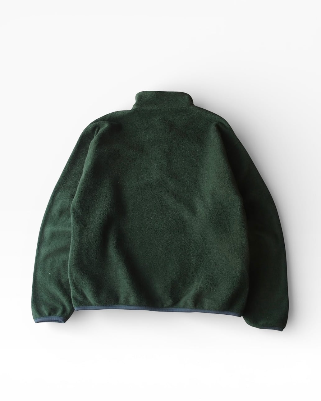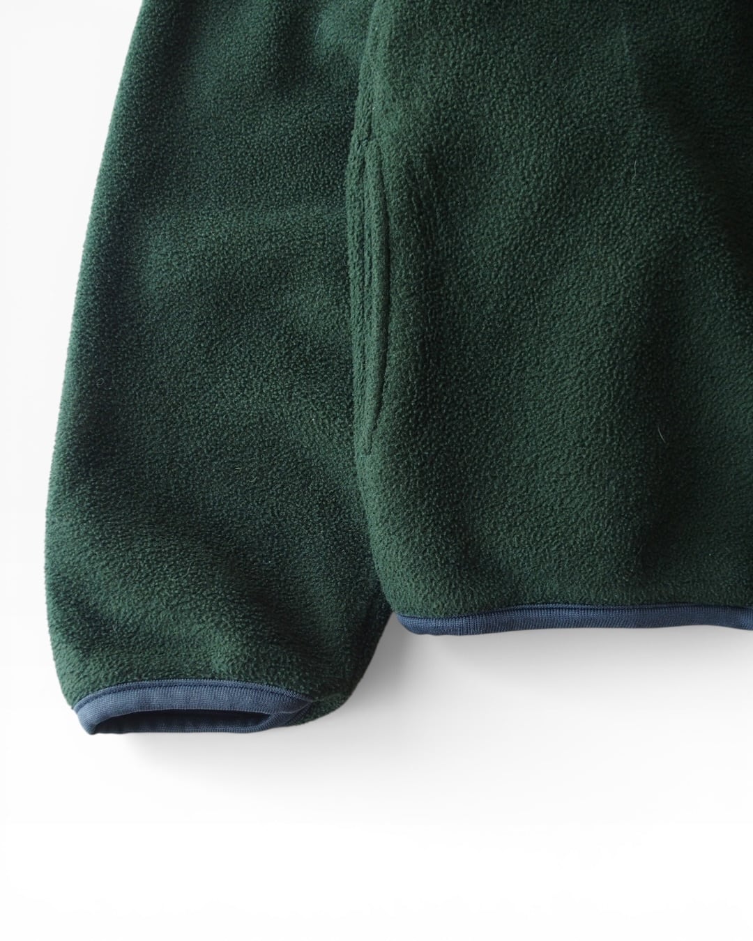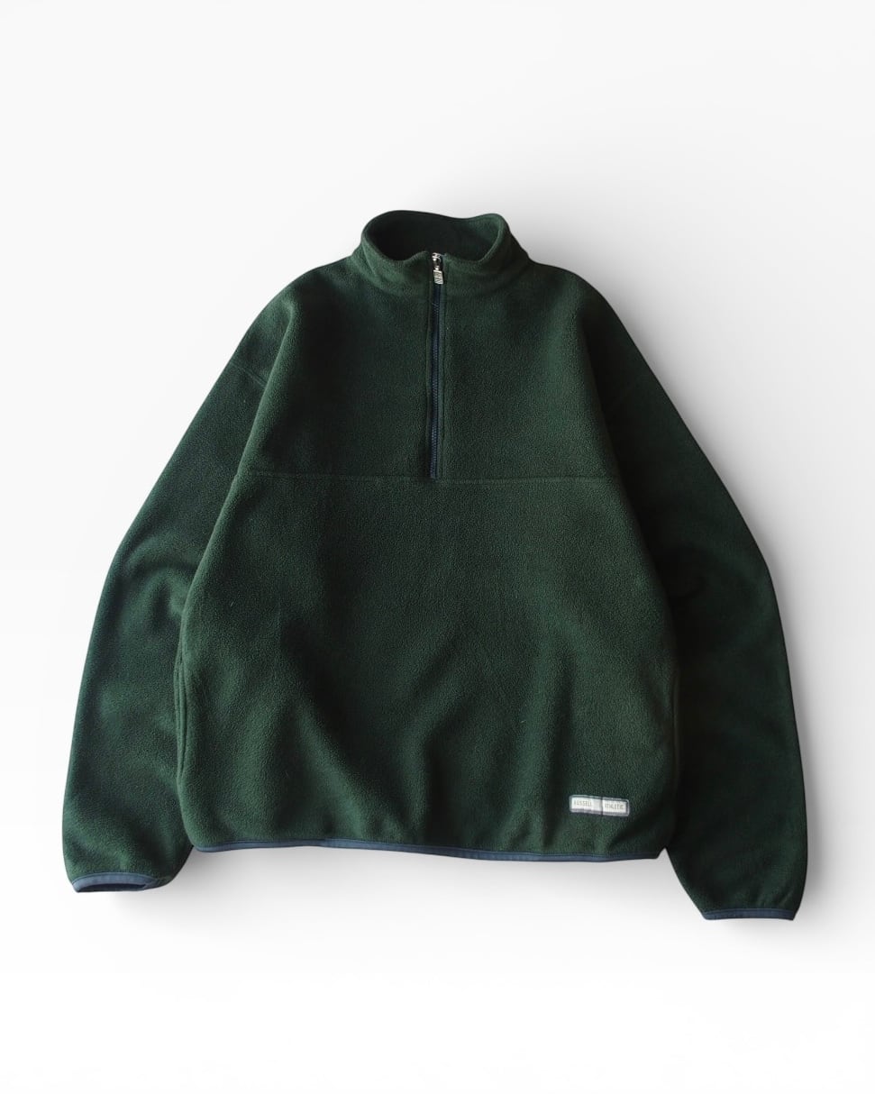 深いグリーンのフリースプルオーバー。