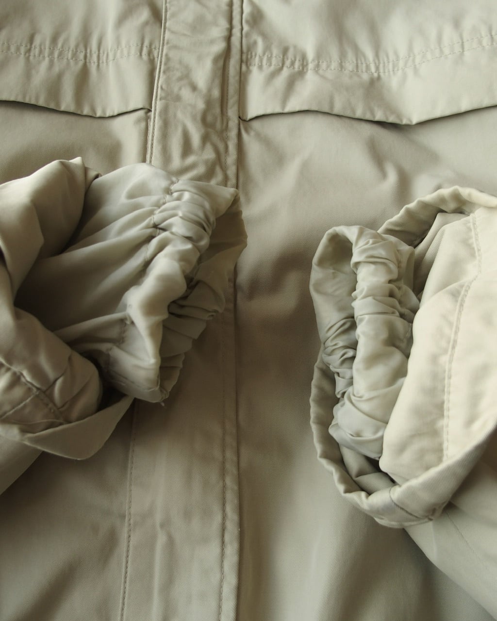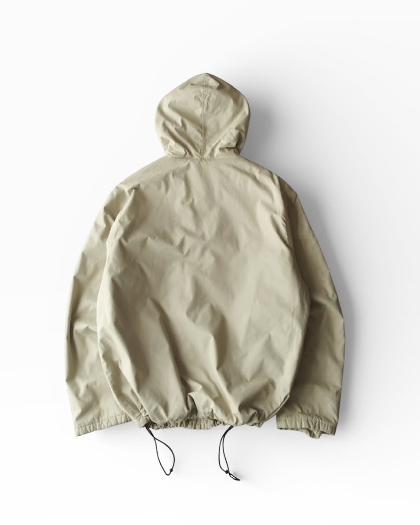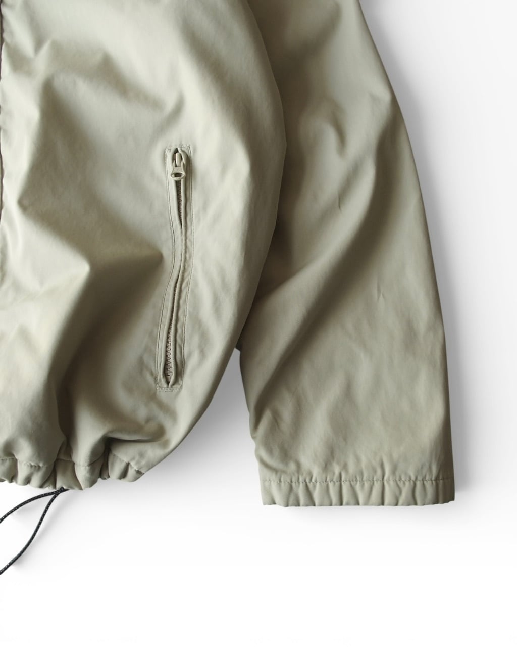 ベージュのナイロンフルジップパーカー。